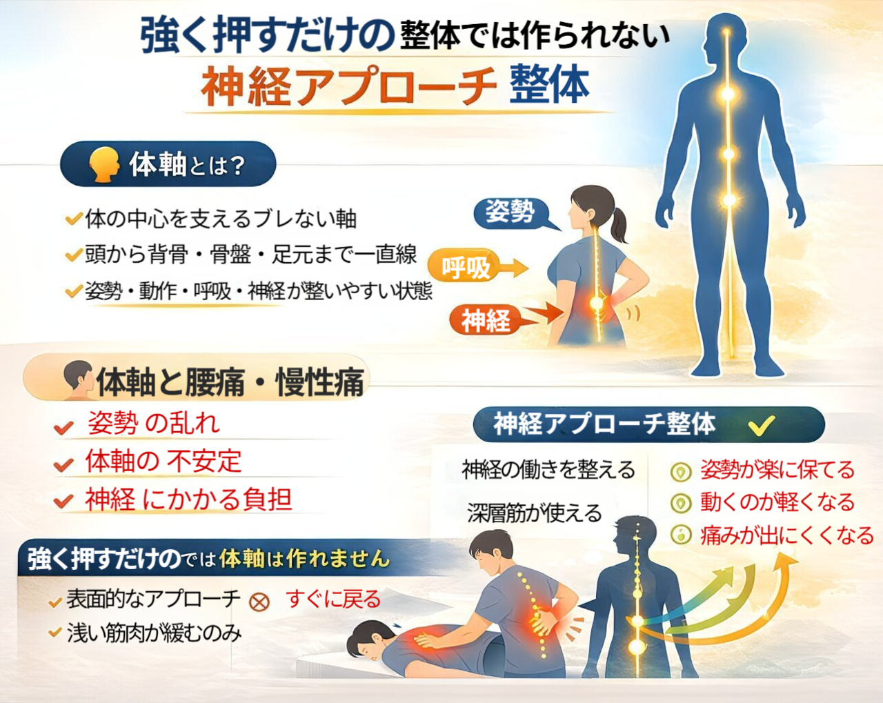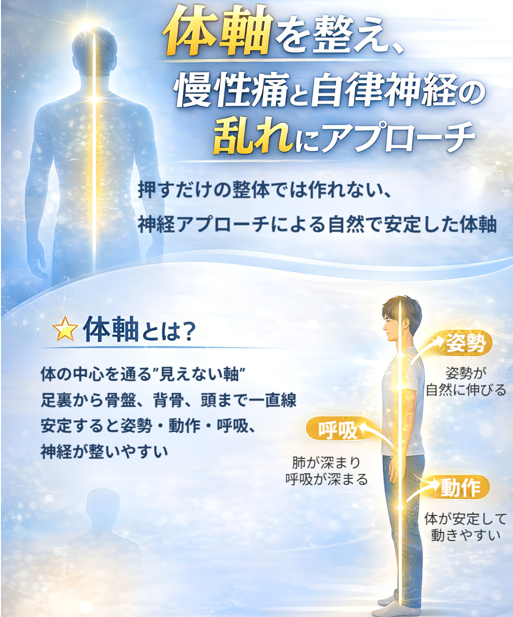 神経の通り・体の支え方・体軸 を整える独自のアプローチを採用。