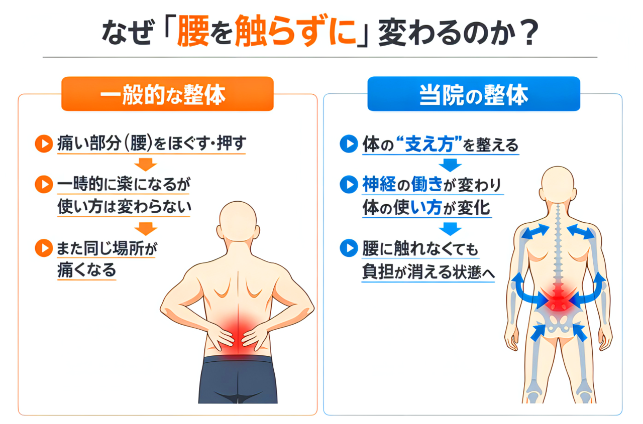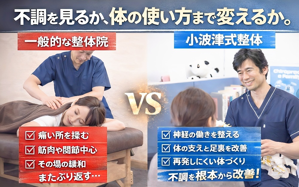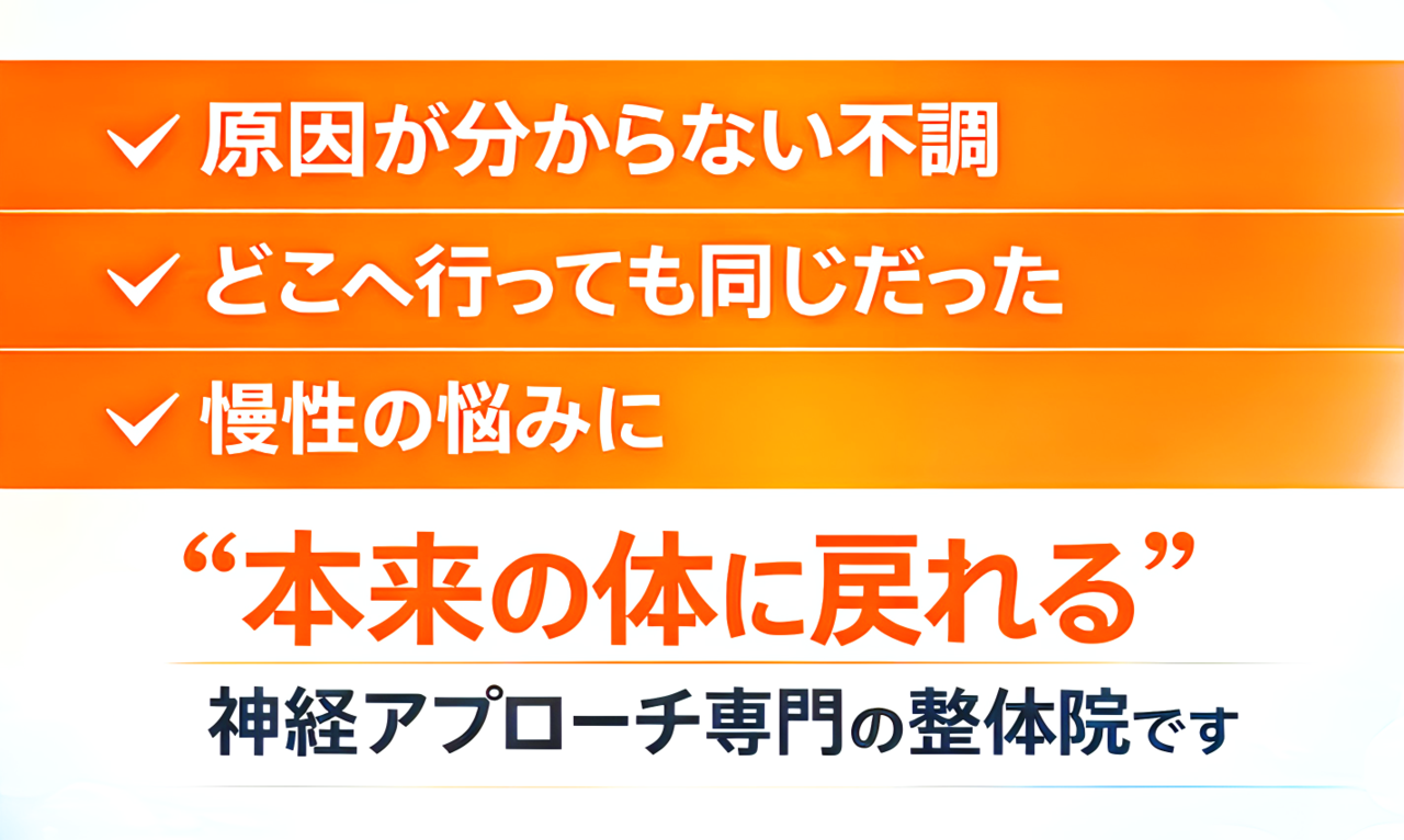 当院の小波津式・神経アプローチ整体は、痛い場所を追いかけるのではなく “体の土台” を整える整体です。