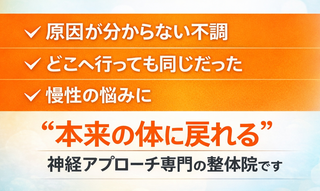 一般的な整体は筋肉や骨格を中心に施術しますが、多くの慢性痛や不調の本質は、実は“神経の不具合”にあります。