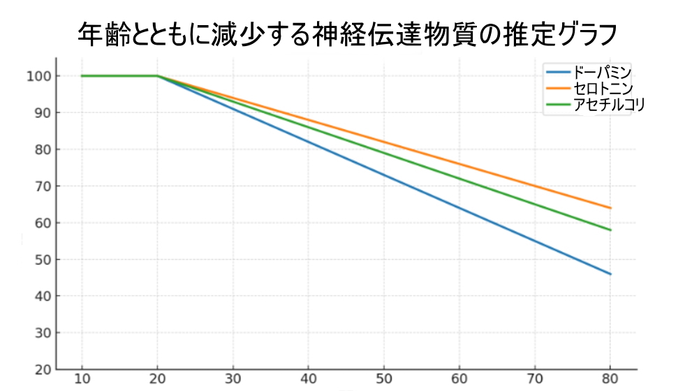 神経伝達物質(ドーパミン・セロトニン・アセチルコリン)は、若い頃は高水準ですが40代〜50代あたりからの下降が顕著です。
