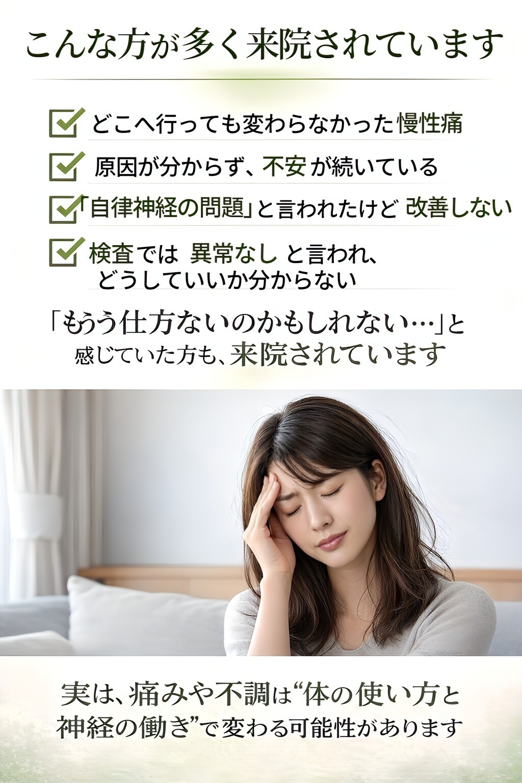 あなたの症状に“その場しのぎではない”最適なサポートを行います。