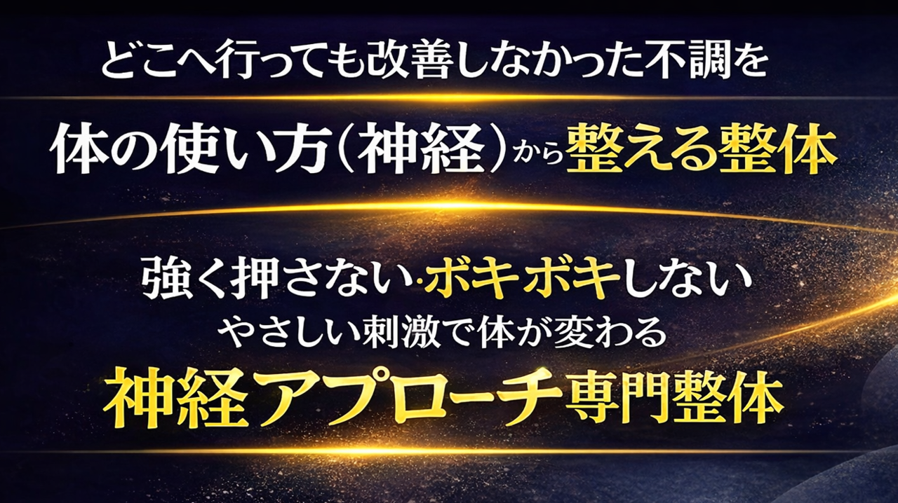 しかし、多くの慢性痛や不調の根本には、神経の伝達エラーや体の支え方の乱れが隠れています。