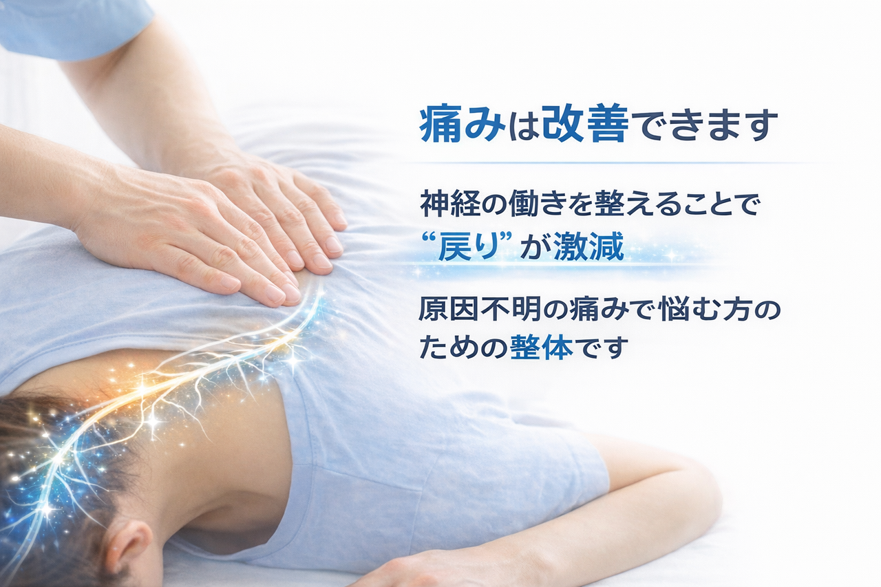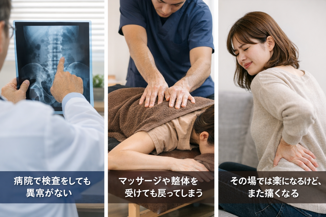 「筋肉を揉む」「骨盤を動かす」といった対症療法ではありません。