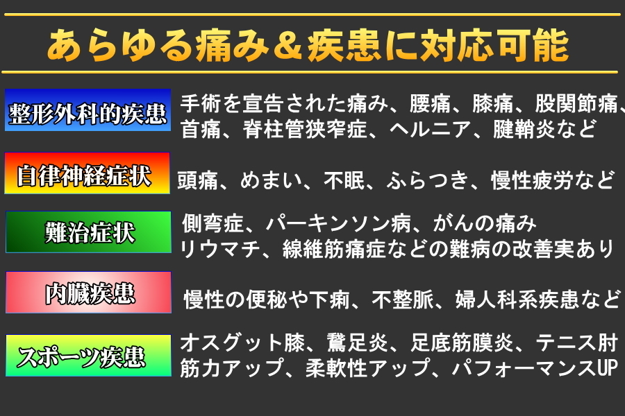 これらを生かし、単なる痛い場所を見る整体ではなく、体全身を見ていく整体で、あらゆるニーズにお応えしています。
